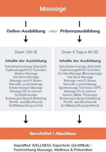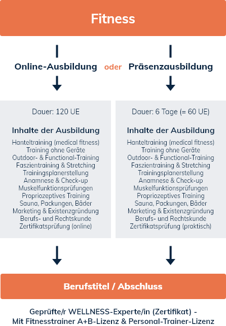 Aktuell bieten wir zwei umfangreiche Ausbildungen an. Eine im Bereich Massage / Wellness und eine im Bereich Fitness. Weitere Informationen zu den Ausbildungsinhalten finden Sie in der Übersicht unten. Mit unserer Massage Ausbildung werden Sie zum Wellness-Experten und erlernen viele verschiedene Massagetechniken sowie rechtliche Grundlagen und wichtige Inhalte zum Thema Marketing & Existenzgründung. Mit unserer Fitnesstrainer Ausbildung erhalten Sie die begehrten Fitnesstrainerlizenzen A und B, sowie die Personal-Trainer-Lizenz in einer kompakten Ausbildung und erlernen auch hier die rechtliche Grundlagen und alles zu den Themen Marketing & Existenzgründung.